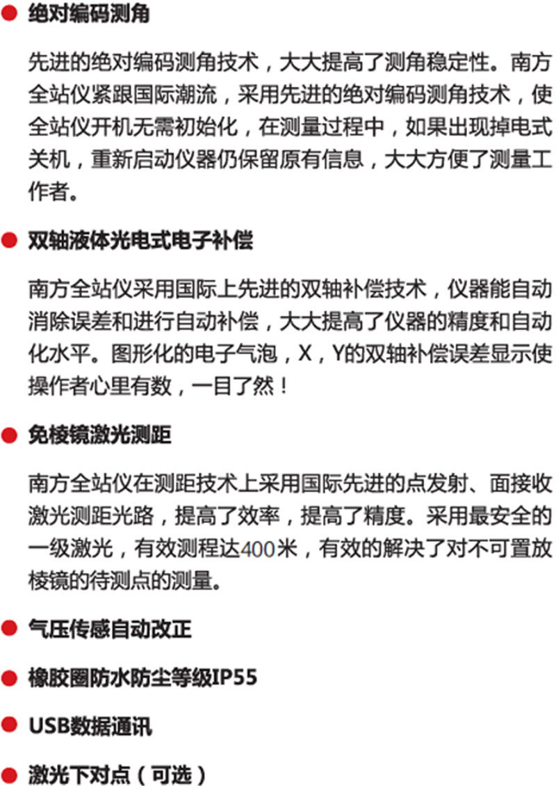 南方332R系列全站仪采用激光测距,绝对编码及双轴补偿新技术,极大降低障率,提高测量作业效率,对所有的相关零件都进行了重新设计和改进,防水,防尘,防潮等问题彻底解决,