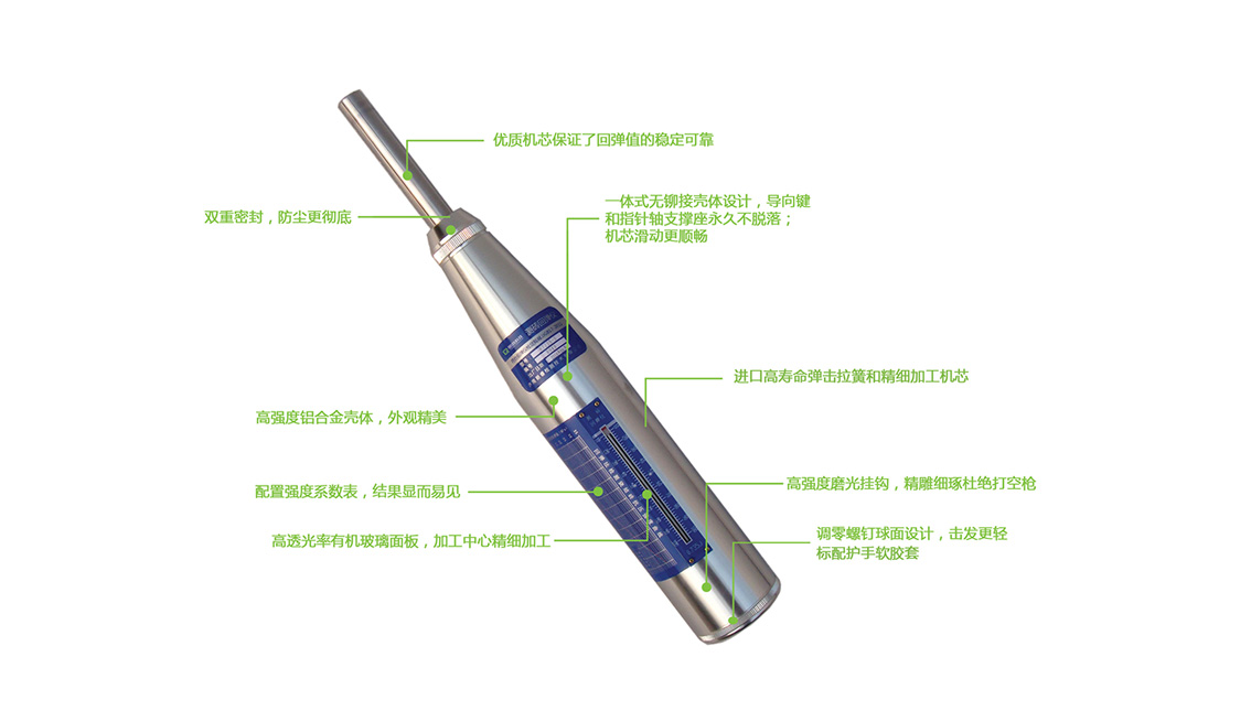 测砖回弹仪是用一弹簧驱动弹击锤并通过弹击杆弹击烧结普通砖砌体或烧结多孔砖砌体中砖表面所产生的瞬时弹性变形的恢复力,使弹击锤带动指针弹回并指示出回弹的距离,以此回弹值作