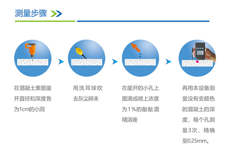 混凝土浇筑成型后,其中的Ca(OH)2与空气中的CO2或水分中溶的CO2反应生成CaCO3而失去碱性的过程。测量原理是通过酚酞溶液遇碱变红色的特性,测量碳